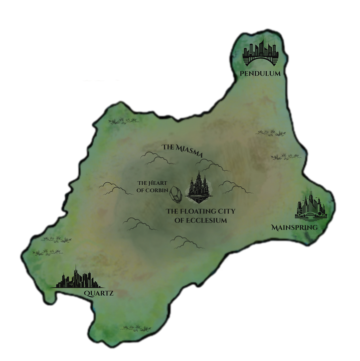 Corbin is a unique and insular kingdom defined by its constant struggle for survival against a toxic and ever-present atmospheric phenomenon known as the Haze. Located on a landmass shaped like a bowl and surrounded by water, Corbin is a land of obscured dangers and clockwork ingenuity. The Great Plague, a devastating event that swept the world of Eldross, is a central part of Corbin's history, as it brought about the Haze and forever changed the people and their culture.